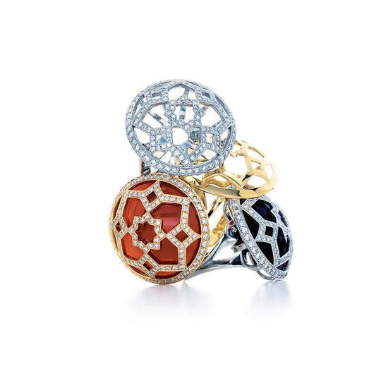 在这之前,Tiffany从未有过推出过如此强烈醒目的珠宝款式,而Paloma Picasso的设计风格偏好娆的形状、链环与编织,表面高度抛光或者有质感的浮凸纹理,并加以独到的色彩搭配。她喜欢用大颗具有异国情调的彩色宝石,从茶晶、红玉髓、黄色石英石、橙色猫眼石、粉红色碧玺到艳蓝色的坦桑石,不一而足。