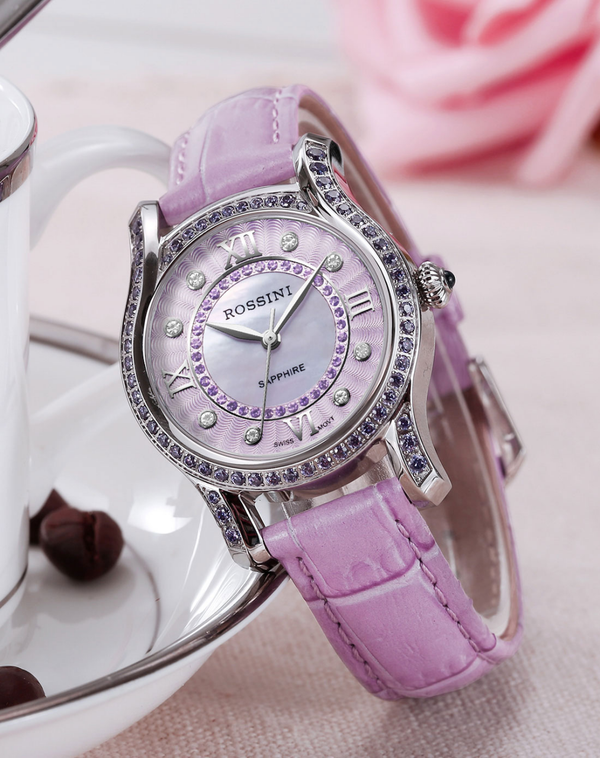 紫色一向都是高贵和浪漫的代言色彩,紫色的梦幻色彩使得法国普罗旺斯成片的薰衣草成为了每一个女生向往的地方。罗西尼SR5628采用高雅的紫色搭载瑞士进口机芯,独树一帜的竖琴表身设计,精美锆石上套,赋予腕表无穷的浪漫色彩。萌妹纸是不是一眼就爱上了呢?