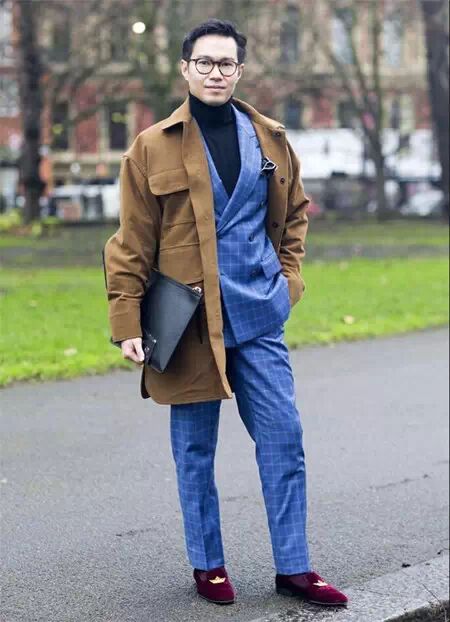 如果你想尽量显得自己更年轻更潮一点,那么你就可以挑选亮一点的颜色,摘下领带,换上高领打底衫。混搭的感觉也是棒棒哒!哦对,配饰也不要含糊,眼镜、手拿包、还有更加亮眼的鞋子!